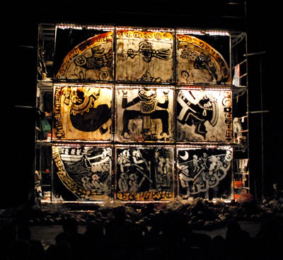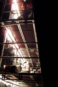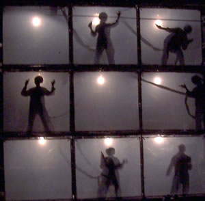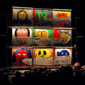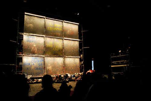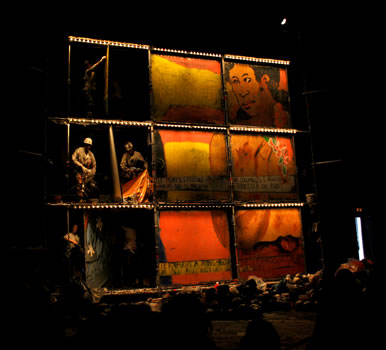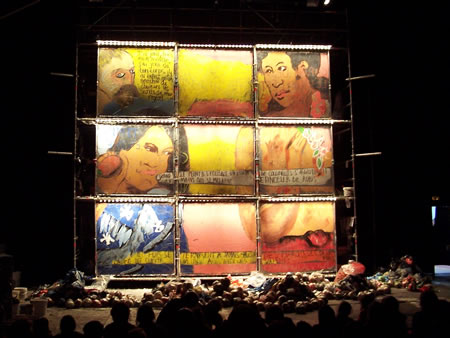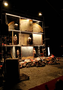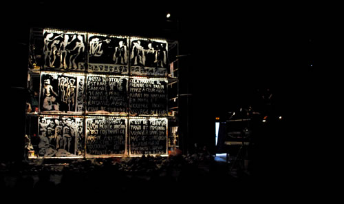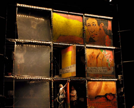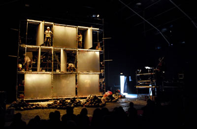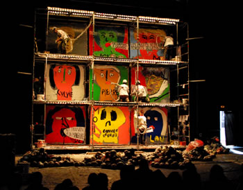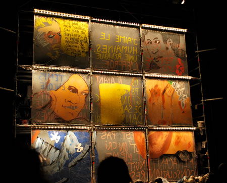 Le principe ; un grand échafaudage sur lequel sont accrochées 9 toiles transparentes réversibles que les 6 peintres/comédiens vont se partager et s'employer à remplir pour écrire un récit en image et en musique.
