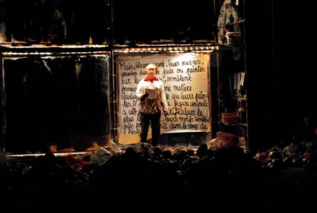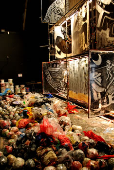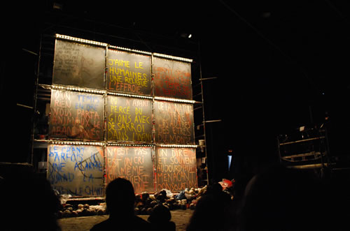 « Spectacle en chantier ! » Et les mots ne sont pas de trop, dès l'entrée dans la grande halle, on est dans l'ambiance : Peinture, bâches et outils en tout genre tapissent le sol.