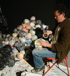 Ici, Luc prépare ses « balles de plastique », réalisées avec ses toiles. |