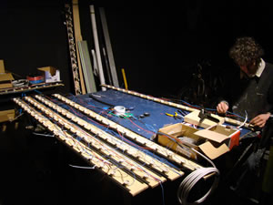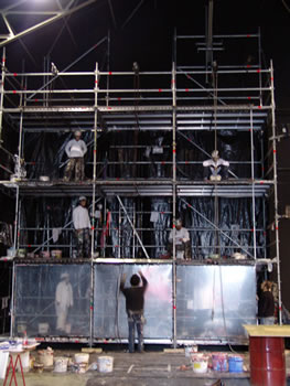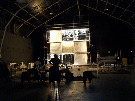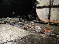 La compagnie aura profité de cette escale au Fourneau pour travailler sur la production du chant et de la musique, ainsi que pour peaufiner le travail de ses images. Il aura fallu peu de temps à l'équipe pour prendre ses marques, la grande halle du Fourneau s'est transformée en un vaste chantier. Peinture, bâches et outils en tout genre ... tapissent le sol. |