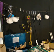 Harnais, casques et bleus de travail, l'équipement du parfait plasticien-chanteur-acrobate. |