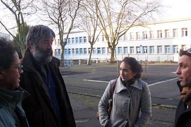| Lundi 25 janvier, repérage dans le quartier de l'Europe afin de voir les lieux susceptibles d'accueillir les spectacles du répertoire de Tango Sumo, que la compagnie proposera d'ici juin. Ci-contre, François Bellandre de la MPT de Pen Ar Créac'h, Ludovic Mingeant du Patronage Laïque du Pilier Rouge, Thaïs Le Saux et Olivier Germser de Tango Sumo. | ![]() |