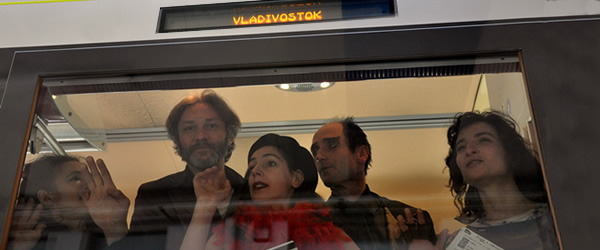 Dimanche 18 mars, mise sur les rails de la tournée Brest-Vladivostok. Une trentaine de personnes est venue accompagner le collectif Z.O.U. du Fourneau jusqu'à la gare de Brest aidant ainsi à porter les 100 kgs de bagages de la compagnie. Suite à ce premier petit périple, il est temps d'amorcer LE vrai périple. C'est Simone Hérault qui annonce le départ du train, le temps d'une dernière photo de groupe, de quelques au-revoir, il est déjà 12h12, l'heure de prendre le train en direction de Vladivostok...