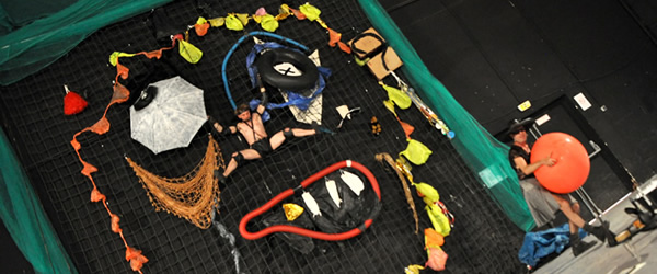 Vendredi 3 mai 2013 à 19h12. Antoine Le Ménestrel et Jean Marie Maddeddu présentent OBA, création issue de leur nouvelle collaboration. Depuis 20 ans, ils sont régulièrement partenaires et confrontent leurs univers et leurs disciplines – la danse verticale de l'un et la composition et l'expérimentation musicale de l'autre – au travers de leurs créations communes.