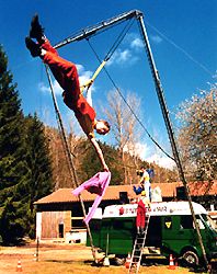 Un portique de 10 mètres incliné de 30° par rapport à la verticale, calé et haubané sur une camionnette. A partir de cette étrange structure (entre chantier mobile et plate forme pétrolière !), 3 ouvriers, têtes et corps en l'air, tentent d'exercer leur métier. Cascades et acrobaties aériennes s'enchaînent à un rythme endiablé : dans cette équipe, tout est prétexte au ludique et au rêve !