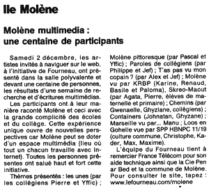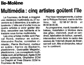 Un espace multimédia ouvert toute la semaine (Molène, 29/11/00) Molène vue par ... les artistes multimédias (Brest, 29/11/00) (les articles ne sont plus disponibles sur le site du journal)