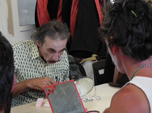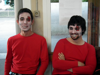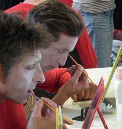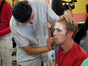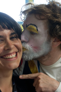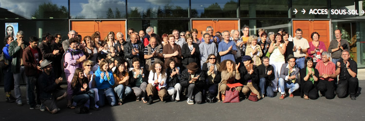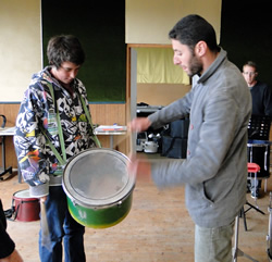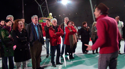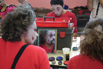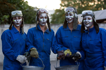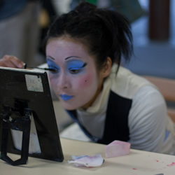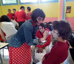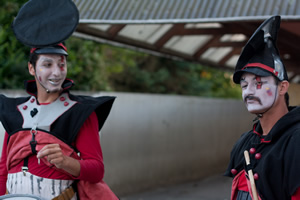 20h30 Après un repas fourni à l'Alizé, c'est le branle-bas de combat dans les loges. Les tambours embarqués et artistes de la compagnie se maquillent aidés par l'équipe du Fourneau. Les loges prennent des allures de Pays des Merveilles, les costumes sont enfilés et chacun commence à se concentrer pour le spectacle. Les tambours impatients jouent dans la cour de l'école. Dernières touches de rouge par-ci, de noir par là et d'argenté pour finir ; Gilles Rhode donne rendez-vous à tous ces êtres sortis d'ailleurs pour une grande ronde dans la cour. Il donne ses dernières explications et conseils puis lance la cérémonie d'ouverture et d'encouragement bien particulière et propre aux Transe Express. Que la fête soit belle et le métissage fructueux !