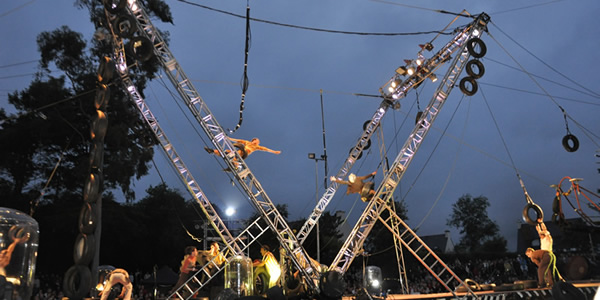 22h32, souriante fenêtre météo : place au spectacle dans ce cadre bucolique, le Parc de Pontanné face à l'Alizé avec Nofit State Circus.