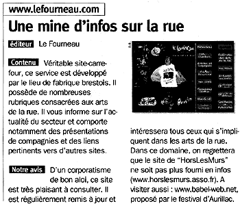 Gonflé, Hors Les Murs qui dans la revue "Arts de La Piste" se permet de noter, comme à l'école, les sites internet des petits copains. Le tout sans contact préalable ...sur le net, ça va de soi! Parler des sites internet Arts de la rue part d'un bon sentiment. La notation révèle un style Hors Les Murs que nous ne cautionnons pas. C'est un peu comme si les 26000 Couverts s'étaient fait inspecter lors d'une avant-première...Mais ça c'est une autre histoire! Et si l'ascenseur est en panne, on s'en fout, on habite au rez-de-chaussée! (Texte rédigé sous le coup de la colère mais resté à ce jour sans réponse...) |