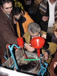 ![]() Une des machines à tarabuster les cailloux... Le mécanisme permet de baigner les cailloux (de Pougne) dans un bouillon de vin, d'huile d'herbes... pour qu'ils se détendent. |