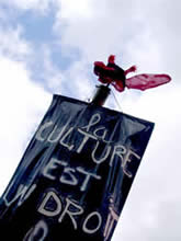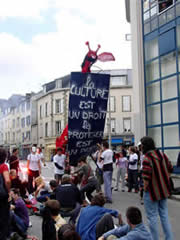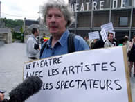 À 15 heures, l’équipe participe à la manifestation (Girafe avec banderole "La culture est un droit, la protéger est notre devoir" reprise dans la presse). Cette participation ne modifiait bien sûr en rien la volonté de maintenir l’action pendant la représentation du soir. Dans ces conditions chaotiques, l’équipe se prépare