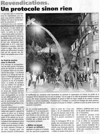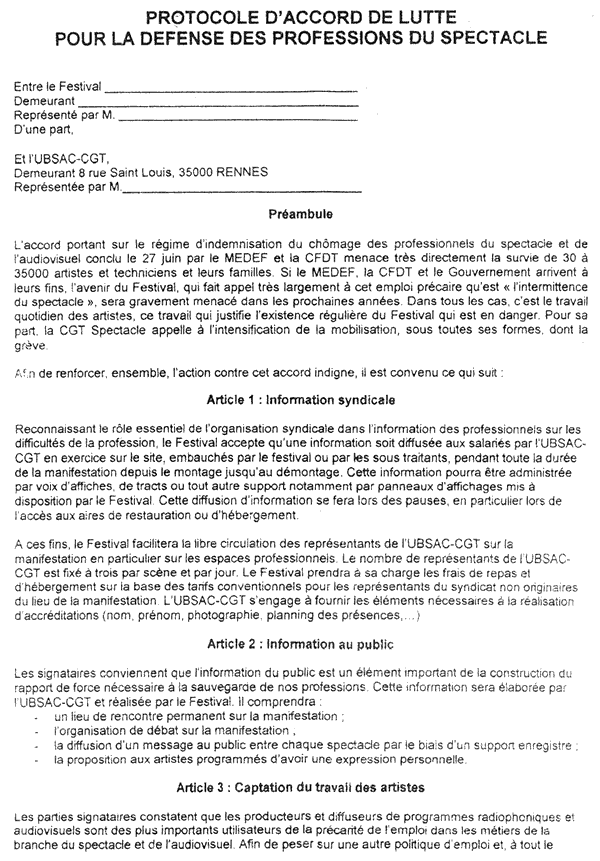 La colère des organisateurs Nous avons décidé de faire connaître au public notre version des faits qui se sont déroulés vendredi", prévient un J-M Le Viol très remonté, à propos du blocage du festival par 200 intermittents. "En début d'après-midi, les membres du syndicat CGT nous ont demandé d'étudier un protocole pour la défense des professions du spectacle, qu'ils nous proposaient de signer, en forme d'acte de solidarité. Des propositions qui nous paraissaient très acceptables. Mais, au moment de signer, on nous a présenté un document différent, comprenant lui, deux articles inadmissibles. Le premier stipulait que : "le nombre de représentants de l'UBSAC-CGT est fixé à trois par scène et par jour. Le Festival prendra à sa charge les frais de repas et d'hébergement...". Le second concluait : "Aussi, le Festival s'engageà mettre en oeuvre des moyens humains, matériels et financiers correspondant au prorata de son chiffre généré par le travail des artistes qu'il emploie soit N€ par entrée, au titre d'un fonds paritaire d'actions de lutte". Cela s'appelle du racket et de la manipulation, estime Jean-Michel Le Viol, et ce reproche ne s'adresse pas aux intermittents en général, mais très précisément à ceux de l'UBSAC-CGT. Il fallait que cela soit dit pour expliquer aux gens notre refus de signer, qui a généré les perturbations de spectacles qui ont suivi". Un écoeurement ressentié galement par Michel Legrand, au nom des "Semaines musicales de Quimper", autre festival de l'été cornouaillais. "Je ne comprends pas bien les gens qui parlent de défense du spectacle en agissant ainsi, souligne ce dernier, le jour où les bénévoles, dont certains hier soir pleuraient, en auront assez d'être insultés et parfois molestés, il n'y aura plus de spectacle. Le droit de manifester n'est pas celui d'empêcher les autres de s'exprimer. L'âme bretonne en a pris un coup, vendredi soir.» "Culturellement, c'est dur, confie le directeur du festival J-P Mauras, nous pensionsê tre en démocratie : quand un artiste a décidé de jouer, il faut respecter sa décision. Cela n'a pas été le cas vendredi. On ne peut se sentir que blessés lorsque vous vous entendez dire par des artistes que vous connaissez, que "Désormais, c'est la guerre." Un dernier point pratique : les personnes ayant payé leur entrée à "Tous aux quais", peuvent se la faire rembourser au bureau du festival si elles l'estiment nécessaire. "Pour nous, il s'agit d'un mauvais coup financier, soulignent les organisateurs, au public de juger si le festival mérite ou non, lui aussi, un geste de solidarité." |