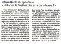 prévu, le 16 juillet à19h33. Ce dimanche 29 juin au Festival des Arts de la rue de Sotteville lès Rouen, avec 44 autres responsables de structures culturelles, nous avons appelé l’ensemble de la profession à nous rejoindre. Depuis, nous ne cessons d’informer le public et nos responsables politiques locaux : la remise en cause du régime des intermittents menace nos structures et le tissu culturel local, tout le monde est concerné. L’artiste n’est pas un chômeur, nous avons le devoir de définir pour lui un statut et une protection sociale digne de notre pays. A défaut d’engagements clairs, nous risquons une remise en cause de ce qui fait l’exception culturelle française. Les compagnies, les lieux de création et les festivals sont en danger ! Que serait l’été morlaisien sans le Far de Morlaix, son impact culturel, touristique et économique? Dans le cadre d’Actions-Public, décidées localement