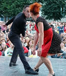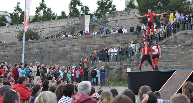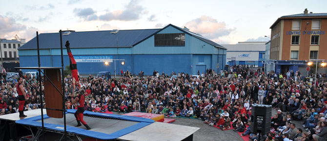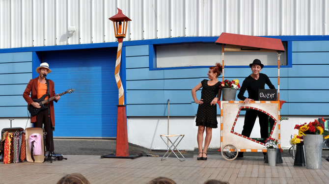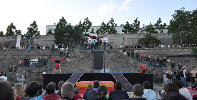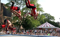 Ce trio de cirque venu de Belgique nous offre un spectacle de rue étourdissant, rempli d'humour et d'énergie, proposant une combinaison de jonglerie, d'acrobaties, de théâtre de rue et d'un maxi-trampoline... Un spectacle qui se déroule à cent à l'heure...
