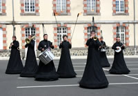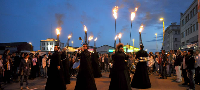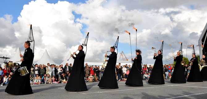 Ignorant les lois de la gravitation, 9 personnages glissent parmi la foule en d’étranges chorégraphies, traçant sur leur passage un chemin musical. Les notes qu’ils dispersent ça et là sont une douce symphonie. Ils s’éclipsent aussi vite qu’ils sont apparus, comme montés sur des tapis volants et partent au fil des places et des rues distiller leur fugue musicale.