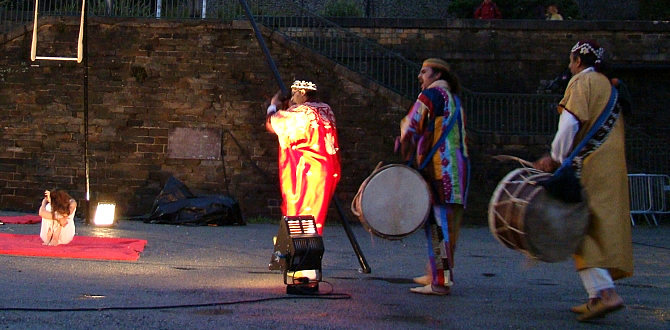 Une petite forme circassienne qui amène progressivement à une transe aérienne sur les rythmes du Luth Tambour et des chants. « Transtrapez » explore la notion du Corps Spectaculaire inhérente au Cirque, à travers la musique Gnawa. A trois, Jane, Jawad et Amine, acteurs et héritiers de deux traditions d’apparences divergentes, tissent ensembles les liens du rassemblement et de la guérison, vont à la rencontre d’un public large et d’une expression moderne de leurs traditions.