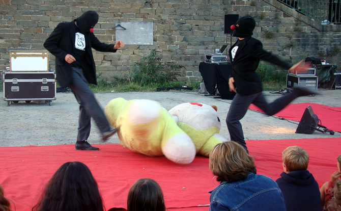 Mettant en scène l’étrangeté et l’anomalie, ils aiment faire rire... mais ils préfèrent encore quand ces éclats de rire restent en travers de la gorge des spectateurs. Parce qu'ils prennent un malin plaisir à jouer comme les enfants jouent, à faire ce qu'il leur plaît sans s’inquiéter du pourquoi et du comment, ces clowns déjantés sont devenus les plus détestés des mamas italiennes !
