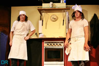 Les portes claquent, les cuisiniers entrent, sortent, se cachent et règlent leurs comptes avec fracas. Un coquard à l'oeil et un gag plus tard... le gâteau à la crème est prêt et fait diablement envie... La cerise sur le gâteau de ces deux funambules du rire c'est bien sûr un catapultage de tarte à la crème... sans filet.