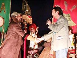 ![]() Poignée de main "symbolique" entre le chef, ou plutôt le doyen, de la délégation Poddème et l'animateur de Longitudes JC, Jean-Claude. |