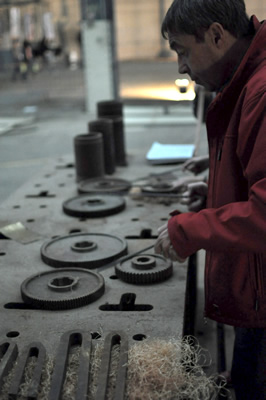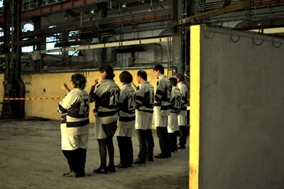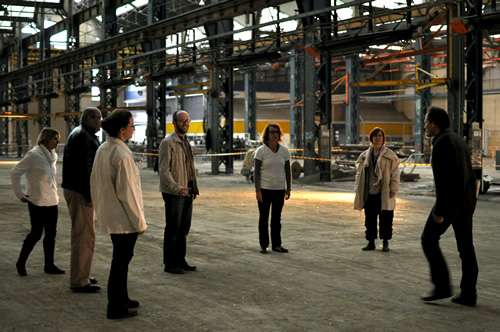 Ça et là, répartis dans les espaces gigantesques des halles des ateliers, les groupes s'activent. Tandis que les panneaux de sécurité entament leur danse étrange, les vieux projecteurs super 8 envoient leurs images d'hier et d'aujourd'hui sur les dos et les torses et les collecteurs de souvenirs recueillent, époussettent et échantillonnent de vieux boulons et morceaux de bois, vestiges datés d'on ne sait quand, laissés à l'abandon par on ne sait qui autour de la vieille machine qui leur sert de décor. Alors que les apprentis cuisiniers dressent leur nappe à carreaux en déclamant leurs plus belles recettes, les gardiens du groupe « phares et balises » répètent lanterne à la main. Puis, les rugbymen de la rime entament leur mêlée, en même temps que les fous de la bobine, d'une halle à l'autre, se scindent en deux clans : les lanceurs d'un côté et les enrouleurs de l'autre. Tout cela grouille et fourmille aux sons de fer et d'acier des morceaux de machines et d'outils mis en mélodie et en rythme par les virtuoses en blouse bleue qui suivent leur chef d'orchestre, tous postés au pied d'une machine majestueuse dominant tous les ateliers.