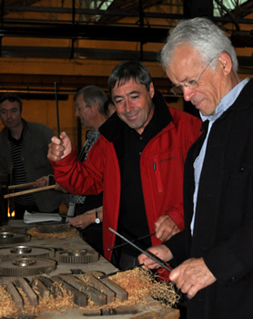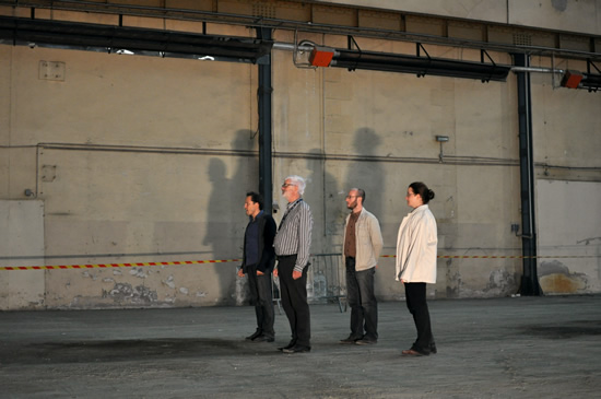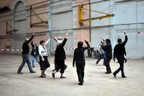 Luc Perrot et Martine Rateau rassemblent leurs troupes pour un premier briefing. Pour cette première répétition in situ, il faudra être efficaces car ils n'ont qu'une heure pour créer une première mouture de leur clins d'œil. Comme le veut le rituel du Fourneau, avant de se lancer dans le travail, tous les participants rassemblent leurs énergies en commençant par s'applaudir eux-mêmes.