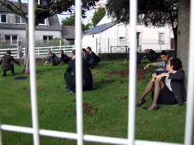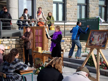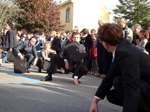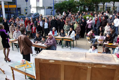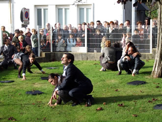 A 16h32, les spectateurs-citoyens se dirigent vers l'Ecole Publique Achille Grandeau où les attendent les "Homos Sapiens Burocraticus" de la Compagnie n°8.