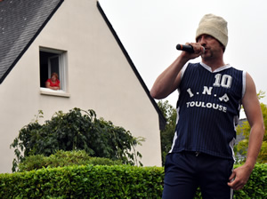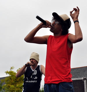 Une fois n'est pas coutume... le ciel est bas et la grisaille a envahi l'espace en ce début de soirée pourtant prometteuse. Mais contre toute attente, la couleur du ciel n'affecte pas la bonne humeur ambiante, palpable. Il faut dire qu'ils font fort les Booster Kingston et General XL, roi du raga-machine et autre prince du hip hop : « Ca fait un, ça fait deux, ça fait trois ! ». Les chorégraphies délirantes s'enchaînent sur fond de rap déjanté, entrecoupées de leurs histoires banales, de leur quotidien de loosers, tellement attachants quand ils se chamaillent ! |