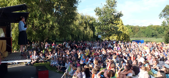 Oulala c'est qu'elle en a réuni du monde Emma en ce beau dimanche inondé de soleil ! Sans doute le fruit de ses occultes incantations avec les esprits du ciel ! Le pré, les gradins sont noirs de monde. Par la fenêtre de sa caravane d'Extra-Lucide, elle dirige à la baguette magique les opérations d'installation du public sur la moquette bleue et la moquette rouge « gratuites toutes les deux »...