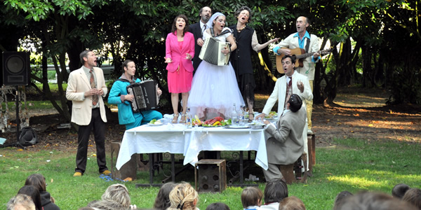 Samedi 28 juillet, 19h12, 2e Pique-Nique Kerhorre 2012, l'heure est à la Noce ! Belle fin de journée estivale pour tous les invités conviés par la Cie Humani Théâtre à se rendre dans le Parc de Kergaret, afin de participer à une noce extraordinaire. Sous le signe de la convivialité et du partage, un apéritif est offert à tous : cocktails revigorants et toasts appétissants. Cela augure de festifs moments à venir. Les coupes vidées, les trois coups sonnés...