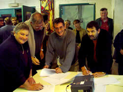 ![]() la convention a été signée par : Marie-Thérèse Callac (maire de Molène) Claude Morizur (co-directeur du Fourneau) Yffic Cloarec (directeur de l'ECM du fourneau.com) Philippe Emschwiller (président de l'association) |