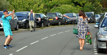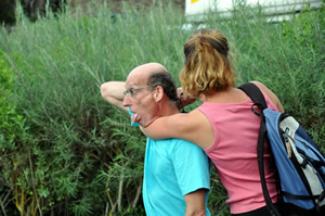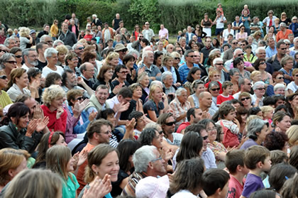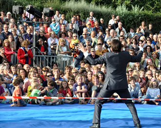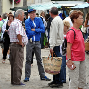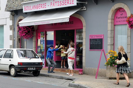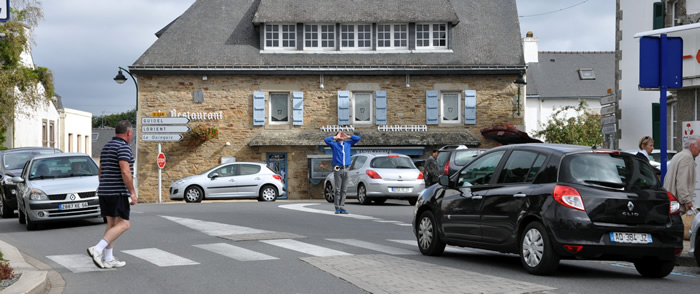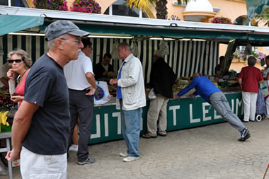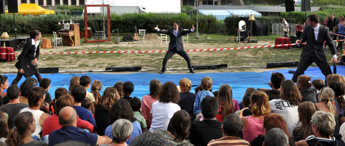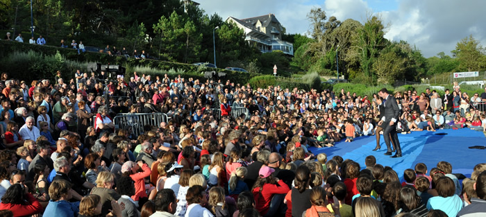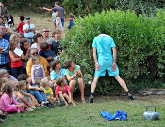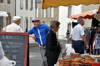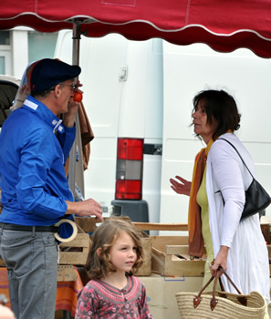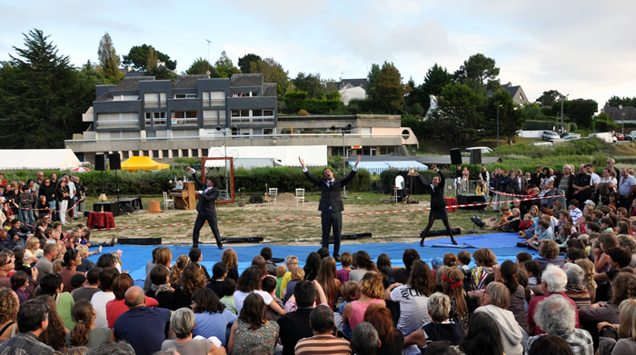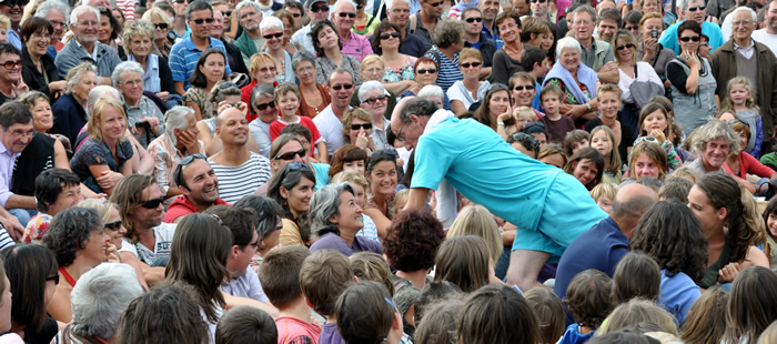 Autour de 11h11, intervention spéciale du parrain de cette 3è édition de Marée de Théâtre de Rue Pierre Pilatte de la compagnie 1 Watt au marché de Clohars-Carnoët.