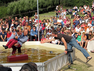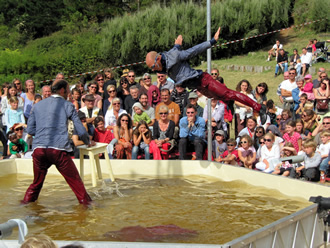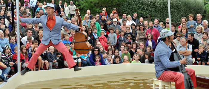 La compagnie Barolosolo m'aurait presque fait abréger mon séjour aux RIAS ! Avec la mer en toile de fond, dans un kiosque-piscine, les 2 comédiens-musiciens jouent avec mon élément, l'eau, pendant près de 45 minutes. Mes nageoires ont frétillé sans cesse au rythme des rires, des Oh ! et des Ah ! du public massé autour de l'Île Ô, malgré l'heure quasi matinale de ce dimanche matin.
