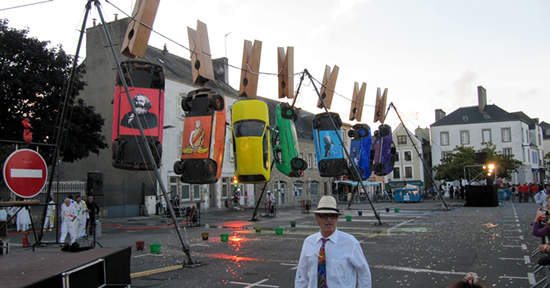 Sans faire attendre les 7 000 personnes venues à cette première rencontre avec moi au festival Les Rias, les comédiens de Générik Vapeur et les bénévoles qui les accompagnent s'activent pour découper en morceaux (de la taille d'une voiture) la longue anguille que traînait le tracteur dans les rues de la ville et, en moins de temps qu'il ne faut pour l'écrire, ils décident de lever ces voitures sur l'énorme fil à linge tendu en travers de la place. Pissant leurs huiles aux 7 couleurs du jour et fumant d'une gaie pollution, voici les 7 voitures accrochées à des pinces à linges, sous le soleil quimperlois, en attendant que la panne « sèche », en tout cas, pas elle des sens ce soir ! Et d'un coup de colle de poisson, les artistes recouvrent leurs ventres métalliques d'affiches représentant des portraits d'illustres penseurs. Galerie éphémère et colorée de la diversité humaine, mi-pluie, mi-soleil, annoncée par l'arc-en-ciel créé ici par une myriade de papiers colorés propulsés sur les spectateurs.