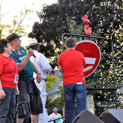 | Déjà, le tonnerre gronde, annoncé par une rafale de pétards mitraillette tandis que, sur la petite scène, le président de la COCOPAQ, Nicolas Morvan, accompagné des co-directeurs du Fourneau, sonne le gong symbolisant l'inauguration officielle du festival Les RIAS 2012. | ![]() |