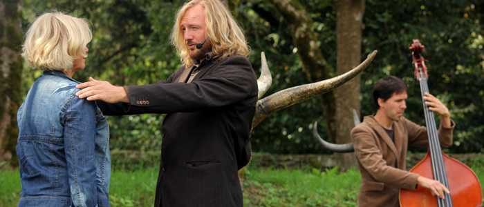 Erreur de jugement. Ici, on ne rigole pas d'entrée de jeu. On surfe sur la crête d'une vague, entre vérité et mensonge, sans gilet de sauvetage. « Les mensonges ne sont que des chimères que le corps ne peut démasquer » annonce l'homme cornu, ravagé lui-même par ses propres menteries. Pour une fois qu'un artiste cite mon nom dans son spectacle, j'en suis ému. L'ambiance sonore est assurée à la contrebasse par son ami Joris, cornu lui-aussi et le public est largement mis à contribution pour permettre au comédien de nourrir son égo de la stupéfaction collective. Dans le parc de l'Abbaye, cet après-midi, il a dû faire le plein !