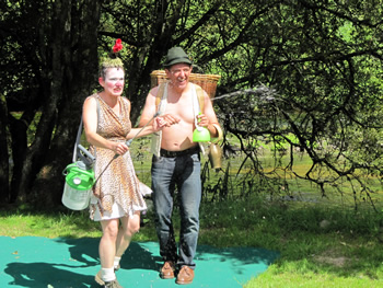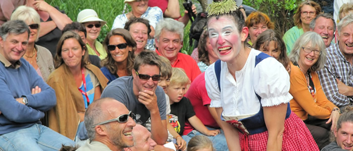 12h32, Arzano : les RIAS dans un écrin de verdure Pour trouver le moulin du Roch sur la rive gauche de le Scorff à Arzano, j'ai été guidé sur les derniers 100 mètres par mes amies les loutres qui connaissent bien le lieu, considéré comme un havre pour elles. Ma sortie de l'eau est aussi mon entrée sur scène : blagueuses, les loutres m'ont déposé face aux gradins, déjà bien remplis Je m'éclipse juste à temps car, dans le champ voisin, l'âne Arthur donne la bonne heure de 12 braiments et demi. Car, à Arzano, les balades à dos d'âne valent mieux qu'un passage à cassis. Bruissement de l'eau sur les rochers, chant du vent dans les arbres et, soudain, quelque chose se met à clocher dans ce décor idyllique. C'est Rosie Volt et son troupeau qui entrent en scène. Les enfants des premiers rangs sont ravis mais ils ne le resteront pas bien longtemps… La Natür, selon Rosie, c'est joli et mignon, mais quand on passe l'hiver avec les bêêêtes, seule dans la montagne du Tyrol, la natür revient vite au galüp lors de la fête des transhumances. Une fois son partenaire choisi dans le public et écarté les enfants avec une autorité à l'Autrichienne, la voilà prête pour passer à l'acte... 2 de son spectacle. |