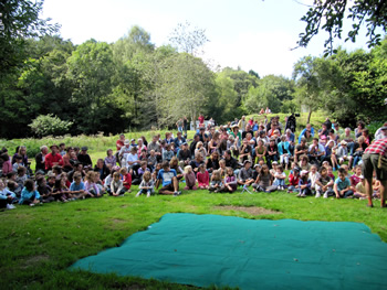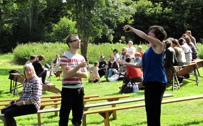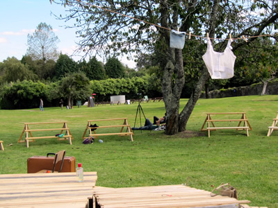 Il est temps de quitter cet écrin de verdure et de me diriger vers Le Trévoux, commune où le Festival migre pour l'après-midi. J'ai dû prendre les chemins de traverse pour me rapprocher du Bélon et arriver aux étangs du Trévoux. Là, la place est prête pour accueillir 2 spectacles et l'espace de convivialité proposé par les habitants.