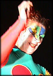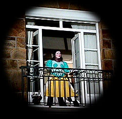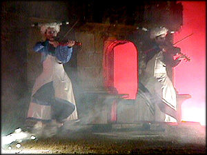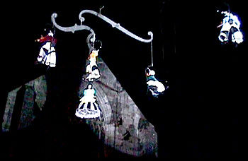 | Place du calvaire. Des violons de Noël dans le ciel de Plougastel et 60 batteurs au pied de l'église accompagnent la chanteuse lyrique et la trapéziste. | ![]() |