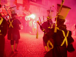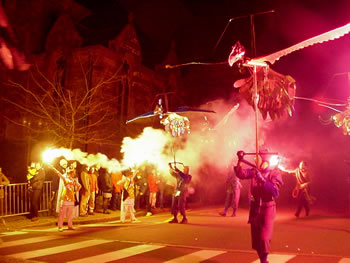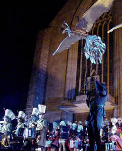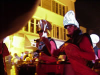 Bourg, autour du Vieux de La Fontaine. La légende voulait que les vux énoncés à la Fontaine du Vieux, lorsqu'ils étaient formulés pour autrui, avaient toutes les chances de s'accomplir. Ainsi, par le récent passé, de nombreux vux avaient été formulés et étaient en passe de se réaliser. Le Bagad de Plougastel qui fut dès la première heure acteur de l'histoire de "Transhumance" partirait ainsi cet été au Canada poursuivre son aventure Opositesque par delà les frontières... Les 33 Batteurs qui participèrent sur cette même place le 18 à 18h18 aux "Violons de Noël", allaient se joindre le 31 au soir aux 1000 autres Tambours réunis à Beaubourg par la Cie Transe Express pour frapper les "2000 Coups de Minuit"... |