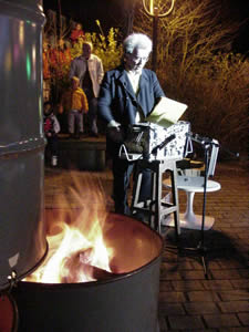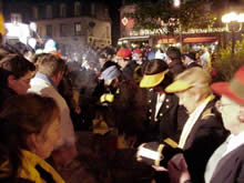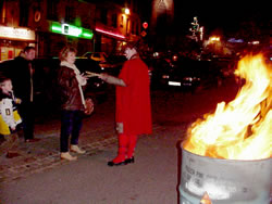 Croyez- moi, ou ne me croyez pas, mais en ce samedi 23, aux 4 points d'accès de la place, 4 personnages s'activaient autour d'un fût en feu et d'une stère de bois. Ces "Bûcheurs" remettaient à chacun une bûche, à transporter jusqu'à l'un des deux grands foyers collectifs. Là, pour se réconforter après l'effort et pour se mettre en condition de vux, chacun recevait en échange de la bûche, vin chaud et marrons grillés...