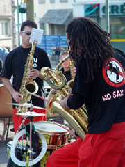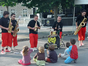 Sur la place du bourg, les NoSax règlent leurs montres : « Votre mission, si vous l’acceptez, sera de donner le coup d’envoi de cette dernière soirée du printemps des arts de la rue 2006 à Plouguerneau ». Et à 19h33 précises retentissent les premières notes de saxophone sous un soleil encore bien présent ! |