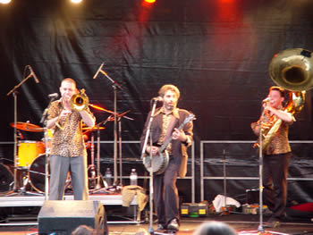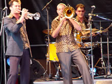 | A 21h33 précises environ, les Pistons flingueurs font à leur tour parler les cuivres et bouger la place avec leurs chansons festives ; le genre de son qui donnent envie de ne pas rester assis ! ! La musique de fanfare énergique et chaleureuse envahit le bourg, oscillant entre ska et rock, les Pistons flingueurs s’éclatent, et le public en redemande ! | |