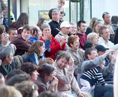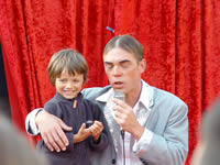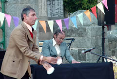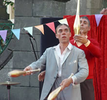 Peu à peu, les NoSax amènent un public maintenant nombreux vers le parvis de l’église où le décor des « Rois de la fête », de la Cie Stromboli, est installé. Un dernier morceau façon free-jazz, et les NoSax passent le relais à Jacques-André, éminent animateur des rois de la fête (formé à l’école Jacques Martin ?), et ses deux acolytes Jean-Denis (magicien-chanteur-musicien-jongleur) et René (instruments en tous genre : piano, trombone, tronçonneuse...). Les quelques 300 personnes présentes suivent avec enthousiasme les numéros de magie, de jonglerie, la musique et les grimaces de nos trois « Rois de la fête ». |