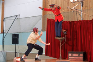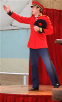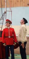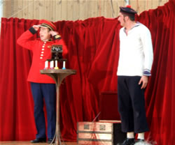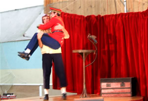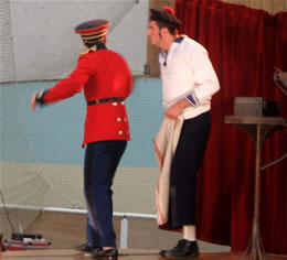 Soudainement, un chant retentit et un adjudant apparaît d'on ne sait où et se dirige vers le public au pas militaire, suivi de son second qui ne lâche pas du regard les pieds de son supérieur, afin de rester dans le rythme de la marche. Première surprise lorsque le militaire prend la parole. Il est tout bonnement incompréhensible. Tout juste parvenons-nous à déchiffrer, entre deux borborygmes, que son acolyte s'appelle Alfred et qu'il est un peu simplet. Mais le contact s'établit malgré tout très vite avec le public par le rire, l'adjudant mettant cinq bonnes minutes à monter sur scène : Alfred, bien qu'extrêmement serviable, se montre légèrement empoté et fait tourner son supérieur en bourrique. Ceux qui attendaient un récital militaire en sont pour leur frais ! Même si le spectacle débute par un récital de clairon pas franchement inoubliable, il laisse rapidement la place au burlesque, les comédiens sortant rapidement du rang pour amuser les spectateurs. La rigueur militaire en prend un coup ! |