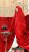 Quelques mois après s'être installée au Fourneau pour travailler sur « La Beauté du Monde », la compagnie Qualité Street retrouvait le Finistère pour, cette fois ci, se produire lors de la deuxième étape du Printemps des Arts dans la Rue en Pays des Abers à Plouguerneau et proposer « La Fleur au Fusil », création de 2004. Malgré la forte pluie qui tombe en ce dimanche 24 mai et qui oblige la troupe à se replier vers la salle polyvalente de la commune, environ 200 spectateurs se retrouvent afin de pénétrer, l'espace d'une heure, dans un monde à part, en compagnie du duo. Devant eux, une petite scène ronde surmontée d'un rideau rouge, qui reste désespérément vide. Mais où sont les artistes ? |