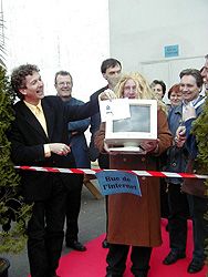 | Ce que les associations Finix, Fourneau et Infini n'avaient pas prévu dans cette inauguration en tout point remarquablement organisée (si, si !), c'était la présence de l'entartreur... celui-là même qui, l'an dernier, n'avait pas manqué Michel Briand. | |